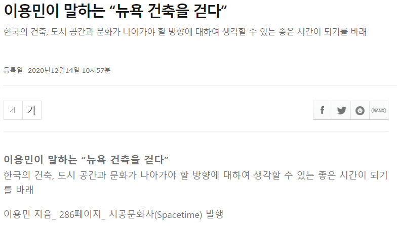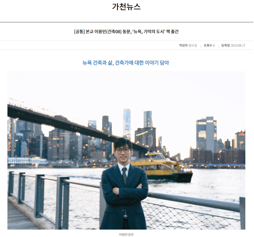 Media Pratt Arch. Collective 전시회, 2025 SBS <과몰입 인생사 시즌2> ep.01. 인터뷰, 2024 서울대학교 빅데이터 혁신융합대학사업단 특강, 2024 가천대학교 교수 저서 전시회, 2024 SFT 본사 사옥 브리크매거진, 2024 SFT 본사 사옥 에이플래폼, 2024 상록청소년수련관 AR/VR 체험관 브리크매거진, 2024 반월역 근린생활시설 에이플래폼, 2024 수암 119 안전센터 신축공사_인천일보, 2025 태백시청사 신관(제2별관) KBS 뉴스, 2023 경기건축가회 초대작가전 OBS 뉴스, 2023 <뉴욕, 기억의 도시> 기사, 한국경제, 임근호 기자 2023 <뉴욕, 기억의 도시> 중앙일보 BOOK, 2023 <뉴욕, 기억의 도시> 중앙일보 BOOK, 2023 <뉴욕, 기억의 도시> 매일경제 신간 다이제스트, 2023 <뉴욕, 기억의 도시>, 가천대학교 가천뉴스, 2023 상록청소년수련관 AR/VR 체험관 개관식 기사, 연합뉴스 김인유 기자, 2023 마실와이드 Brief News, 2023 마실와이드 Brief News, 2022 프랫 인스티튜트 뉴스레터 1월호, 2022 건축전문 YouTube 채널 디지트 TV 인터뷰 ep.05, 2022 건축전문 YouTube 채널 디지트 TV 인터뷰 ep.04, 2022 건축전문 YouTube 채널 디지트 TV 인터뷰 ep.03, 2022 건축전문 YouTube 채널 디지트 TV 인터뷰 ep.02, 2022 건축전문 YouTube 채널 디지트 TV 인터뷰 ep.01, 2022 자랑스러운 가천대학교 동문 선정 및 인터뷰, 2021 ‘뉴욕 건축을 걷다’ 기사, 디지털 타임스, 이미정 기자, 2020 ‘뉴욕 건축을 걷다’ 기사, 에이앤뉴스 전예원 기자, 2020 건축사 뉴스 경기건축문화제 인터뷰, 2017 건축사 뉴스 WA Cup 축구대회 인터뷰, 2017 리틀 미코노스 프로젝트 관련 기사, 경인일보 김환기 기자, 2016