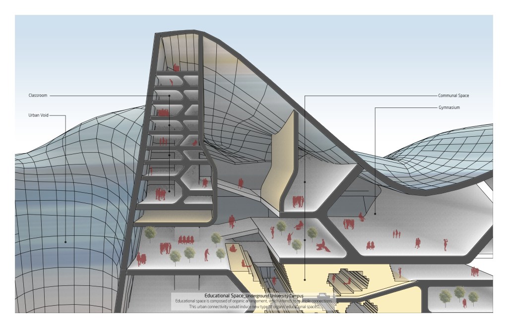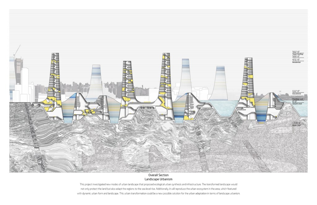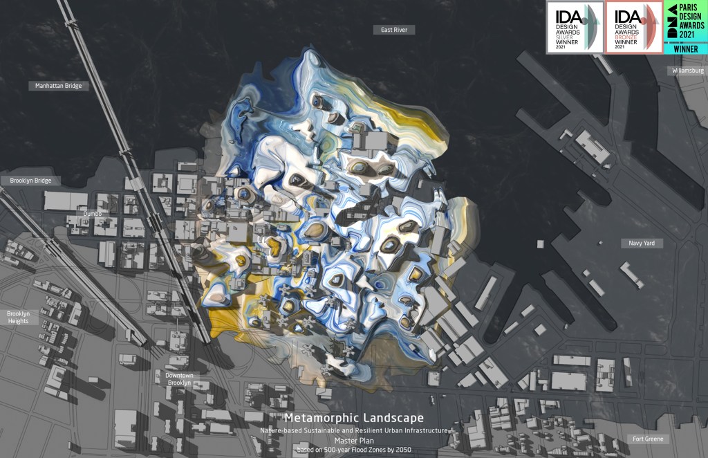Metamorphic Landscape project proposes to integrate architecture, urbanism and landscape into the city as an interdisciplinary design study, based on a forecast data of climate change and sea level rise in New York City by 2050. Through careful urban research and climate change data of Downtown Brooklyn, Dumbo and Navy Yard, Brooklyn, a synthetic form of transformed landscape as architecture would regenerate its urban infrastructure to protect the city from the huge scale flodding as well as maximizing urban density. Additionally, this landscape would provide large scale urban void space in which the stormwater can be collected and transferred to a natural energy. In conclusion, this project investigates a potential possibility of future urban space both above and below ground as a new methodology of increasing urban density in New York City.