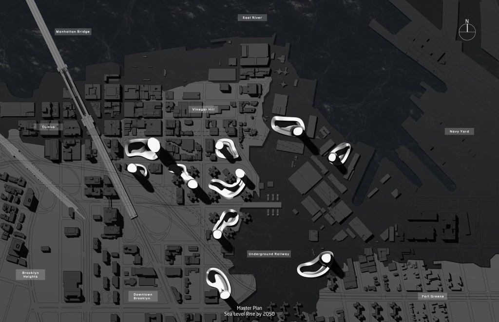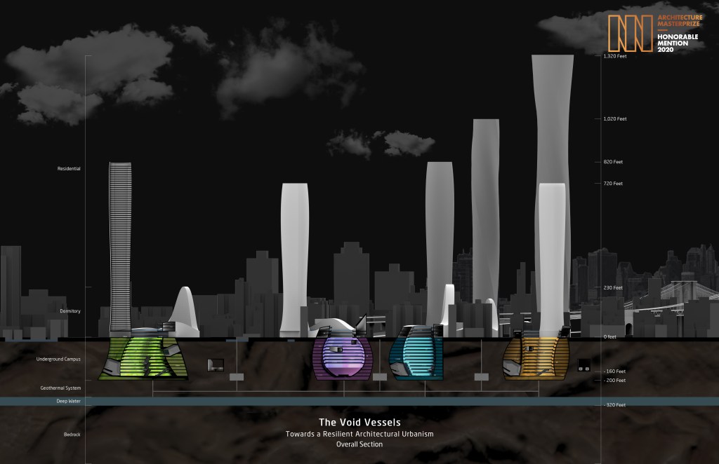 The Void Vessels는 건축적 도시디자인에 대한 새로운 방법론에 대해 연구한 프로젝트이다. 2050년 뉴욕의 기후변화와 해수면 상승에 대비하여 도시적인 밀도를 높이는 새로운 방법을 제안한다. 지하 공간의 가능성에 대해 건축, 도시적 관점으로 재해석하였다. 2050년 뉴욕의 해수면 상승은 다운타운 브루클린 지역에 큰 변화를 가져올 것으로 예상된다. 이는 물리적, 경제적 피해를 동반할 것이고 이러한 자연현상에 대해 적응하는 도시론을 제안한다. 때문에 곡선형으로 구성된 10개의 건축물을 기존 도시의 컨텍스트를 보존하면서 도시 조직에 끼워넣었다. 지하 공간에는 해수면 상승과 기후변화에 따르는 홍수의 피해를 건축물을 통해 적극적으로 받아들이고 거대한 보이드 공간으로 빗물을 모으고 지열 에너지와 결합하여 에너지로 치환하는 도시적 인프라스트럭처를 디자인하였다. 지상 공간의 타워는 주거 유닛으로 배치하여 맨해튼과 비슷한 도시 밀도를 가지도록 하였고, 지하 공간에는 쇼핑몰과 캠퍼스, 공연장 프로그램을 배치하여 미래의 사람들이 지상 공간 뿐만 아니라 지하 공간에서도 동일한 활동을 할 수 있도록 만들었다. The Void Vessels 프로젝트는 자연현상과 관계되는 미래 도시 공간에 대해 탐구하고 새로운 건축적, 도시적 방법론에 대해 제안하는 프로젝트이다.