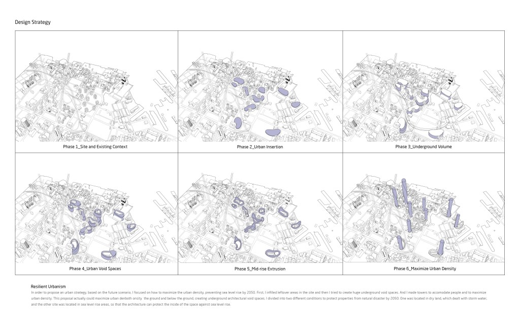 The Void Vessels is a research-based architectural and urban design project. Inspired by natural phenomena – climate change and sea level rise in New York City by 2050, it proposed a new methodology of maximizing urban density, reinterpreting the potential of underground space. Sea level rise in NYC by 2050 would physically and economically change in the Downtown Brooklyn area. Thereby, we would like to propose a adaptive urbanism to the natural phenomena. The ten architectures composed of curved and ameba-like gemetry are inserted into the existing urban context that is preserved. In addition, huge-scale urban void space that would collect the stormwater when flooding event is happened could exchange the energy combined with geothermal energy system as a new type of urban infrastructure. The tower on the above ground has diverse type of residential units so that this site area could have similar urban density to the Manhattan, because the region is very close to Lower Manhattan, which is second denser area in NYC. In conclusion, The Void Vessels project would be a new kind of architectural and urban design proposal, closely related to natural phenomena as a human-made urban infrastructure that means an anthropogenic behavior in this era.